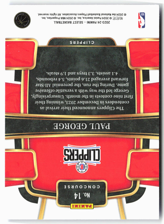 This is a nice example of a 2023-24 Panini Select #14 Paul George Blue (Retail Base) Other important information about this card:In 2023 Paul George played for the Los Angeles...
