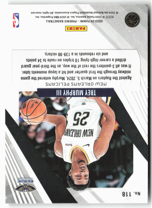 This is a nice example of a 2023-24 Panini Phoenix #118 Trey Murphy III Other important information about this card:In 2023 Trey Murphy III played for the New Orleans Pelicans.Please...
