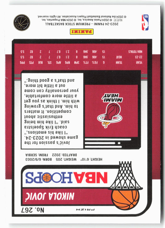 This is a nice example of a 2023-24 Panini Premium Stock #267 Nikola Jovic Silver Prizm Other important information about this card:In 2023 Nikola Jovic played for the Miami Heat.Please...