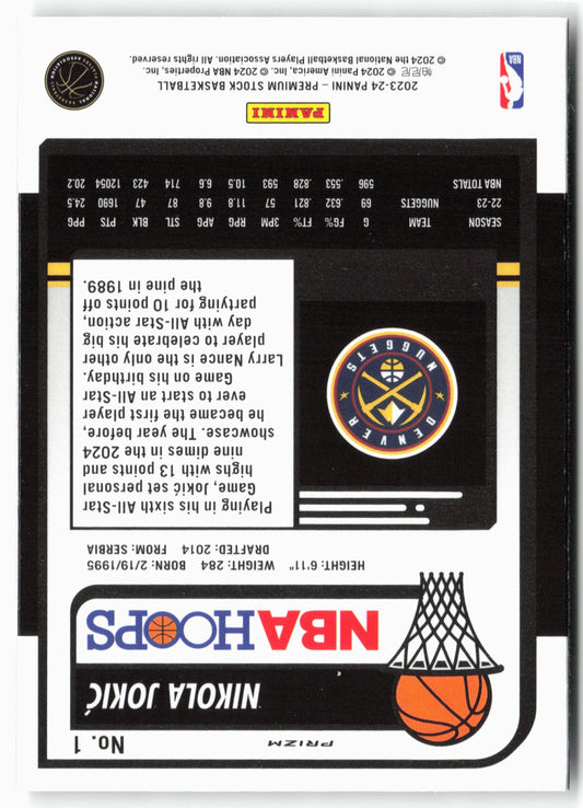 This is a nice example of a 2023-24 Panini Premium Stock #1 Nikola Jokic Seismic Prizm Other important information about this card:In 2023 Nikola Jokic played for the Denver Nuggets.Please...