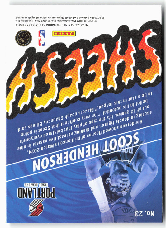 This is a nice example of a 2023-24 Panini Premium Stock #23 Scoot Henderson Sheesh Other important information about this card:In 2023 Scoot Henderson played for the Portland Trail Blazers.Please...