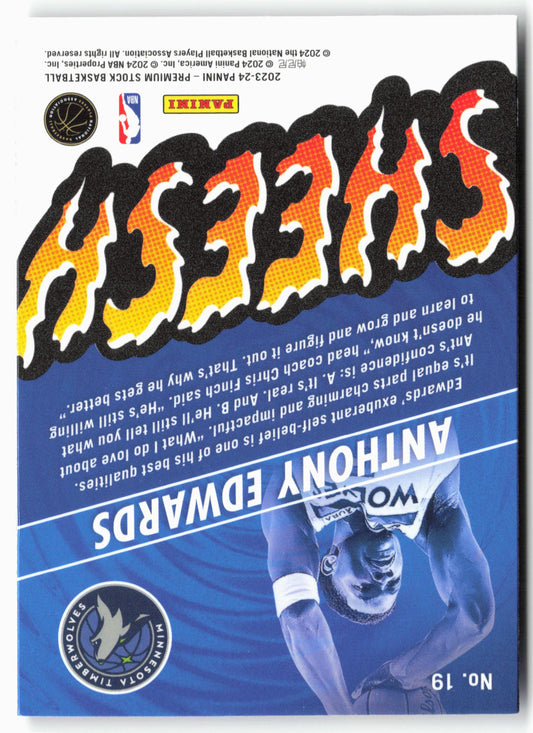 This is a nice example of a 2023-24 Panini Premium Stock #19 Anthony Edwards Sheesh Other important information about this card:In 2023 Anthony Edwards played for the Minnesota Timberwolves.Please check...
