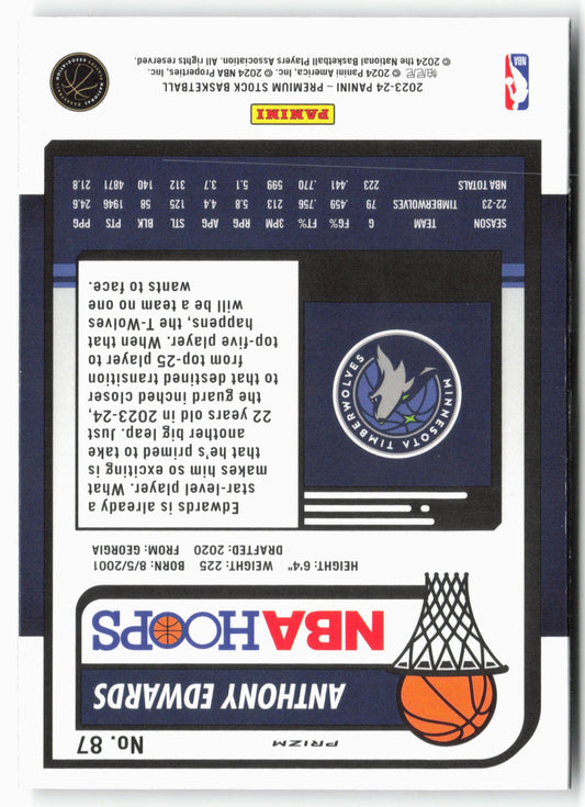 This is a nice example of a 2023-24 Panini Premium Stock #87 Anthony Edwards Ice Prizm Other important information about this card:In 2023 Anthony Edwards played for the Minnesota Timberwolves.Please...