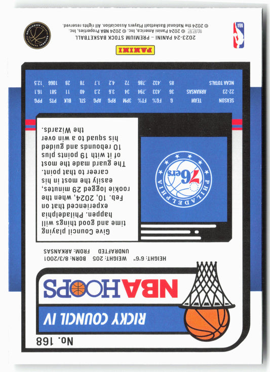 This is a nice example of a 2023-24 Panini Premium Stock #168 Ricky Council IV Other important information about this card:RCIn 2023 Ricky Council IV played for the Philadelphia 76ers.Please...