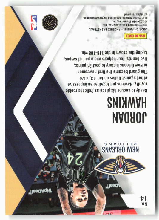 This is a nice example of a 2023-24 Panini Phoenix #14 Jordan Hawkins Instant Phenom Silver Other important information about this card:In 2023 Jordan Hawkins played for the New Orleans...