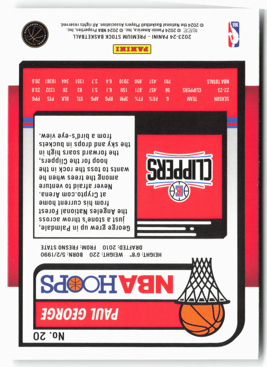 This is a nice example of a 2023-24 Panini Premium Stock #20 Paul George Other important information about this card:In 2023 Paul George played for the Los Angeles Clippers.Please check...