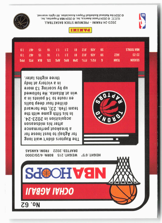 This is a nice example of a 2023-24 Panini Premium Stock #62 Ochai Agbaji Other important information about this card:In 2023 Ochai Agbaji played for the Toronto Raptors.Please check out...