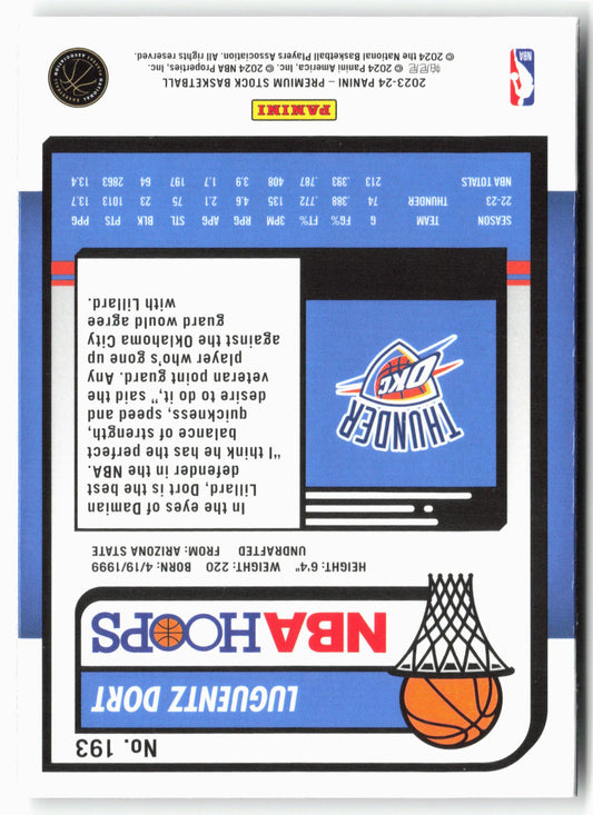 This is a nice example of a 2023-24 Panini Premium Stock #193 Luguentz Dort Other important information about this card:In 2023 Luguentz Dort played for the Oklahoma City Thunder.Please check...