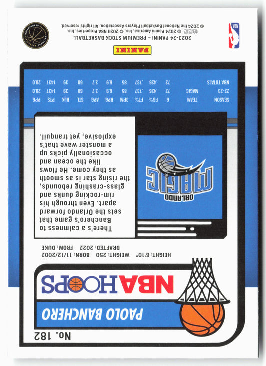 This is a nice example of a 2023-24 Panini Premium Stock #182 Paolo Banchero Other important information about this card:In 2023 Paolo Banchero played for the Orlando Magic.Please check out...