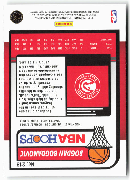 This is a nice example of a 2023-24 Panini Premium Stock #218 Bogdan Bogdanovic Other important information about this card:In 2023 Bogdan Bogdanovic played for the Atlanta Hawks.Please check out...