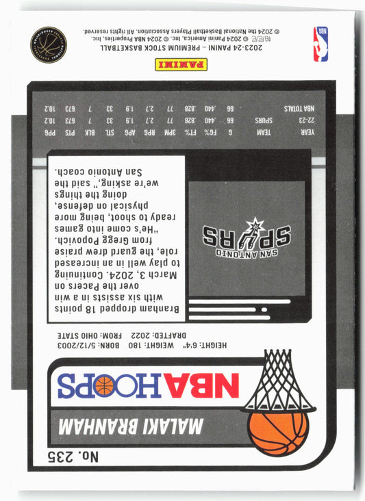 This is a nice example of a 2023-24 Panini Premium Stock #235 Malaki Branham Other important information about this card:In 2023 Malaki Branham played for the San Antonio Spurs.Please check...