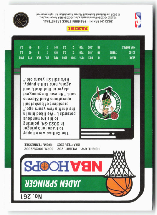 This is a nice example of a 2023-24 Panini Premium Stock #261 Jaden Springer Other important information about this card:In 2023 Jaden Springer played for the Boston Celtics.Please check out...