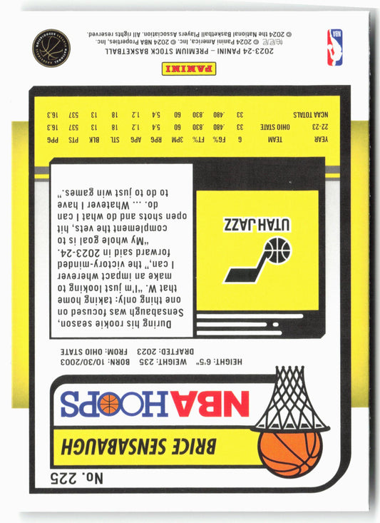 This is a nice example of a 2023-24 Panini Premium Stock #225 Brice Sensabaugh Other important information about this card:In 2023 Brice Sensabaugh played for the Utah Jazz.Please check out...