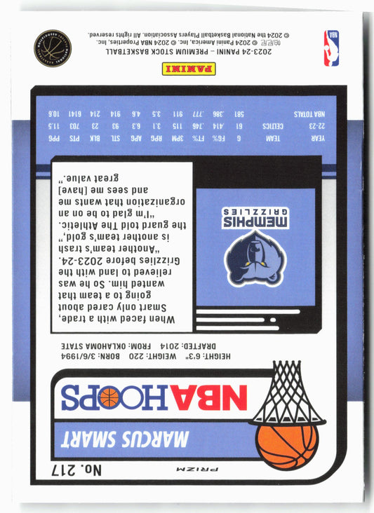 This is a nice example of a 2023-24 Panini Premium Stock #217 Marcus Smart Seismic Prizm Other important information about this card:In 2023 Marcus Smart played for the Memphis Grizzlies.Please...