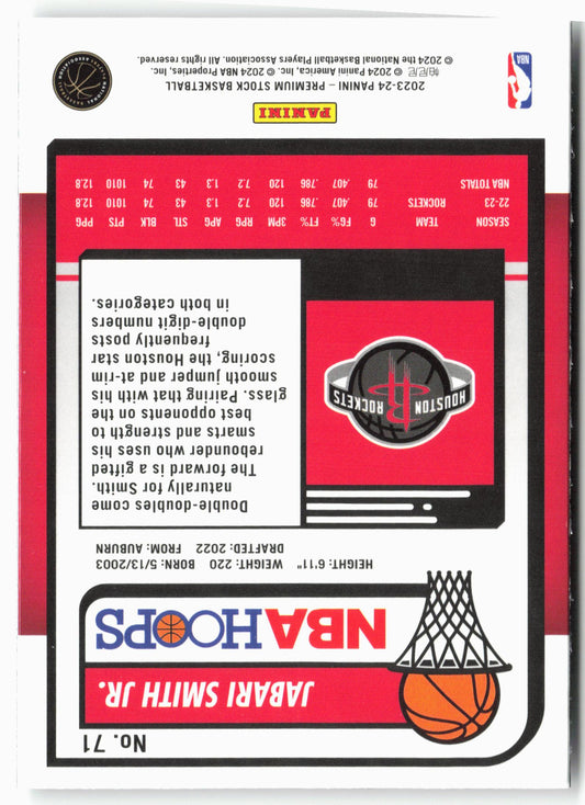 This is a nice example of a 2023-24 Panini Premium Stock #71 Jabari Smith Jr. Other important information about this card:In 2023 Jabari Smith Jr. played for the Houston Rockets.Please...
