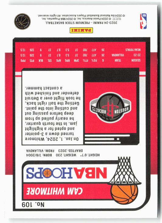 This is a nice example of a 2023-24 Panini Premium Stock #109 Cam Whitmore Other important information about this card:In 2023 Cam Whitmore played for the Houston Rockets.Please check out...