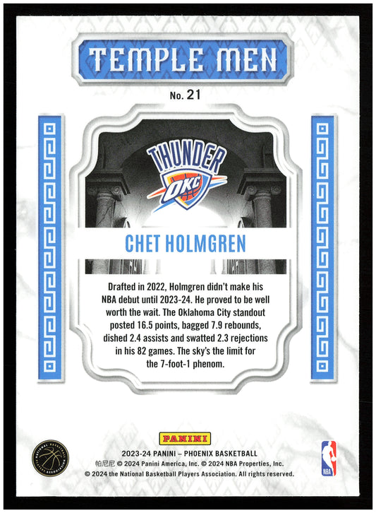 This is a nice example of a 2023-24 Panini Phoenix #21 Chet Holmgren Temple Men Other important information about this card:In 2023 Chet Holmgren played for the Oklahoma City Thunder.Please...