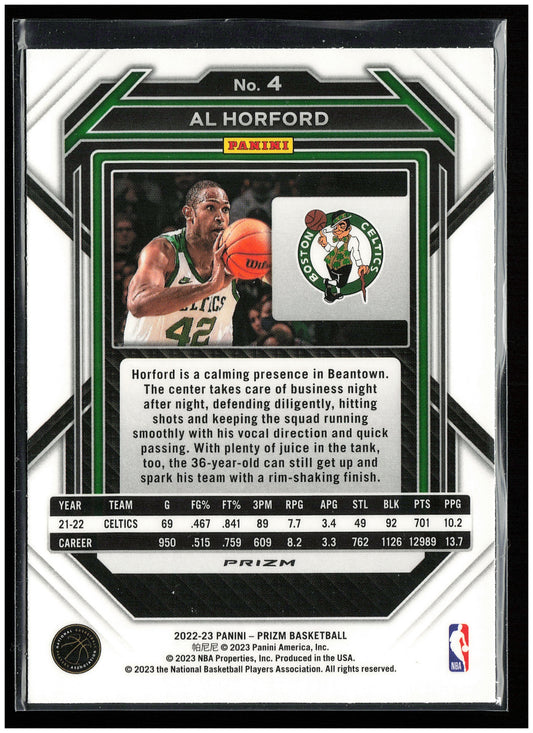 This is a nice example of a 2022-23 Panini Prizm #4 Al Horford Prizms Green Other important information about this card:In 2022 Al Horford played for the Boston Celtics.Please check...