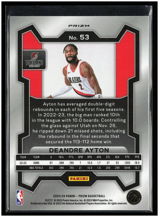This is a nice example of a 2023-24 Panini Prizm #53 Deandre Ayton Prizms Red White and Blue Other important information about this card:In 2023 Deandre Ayton played for the...