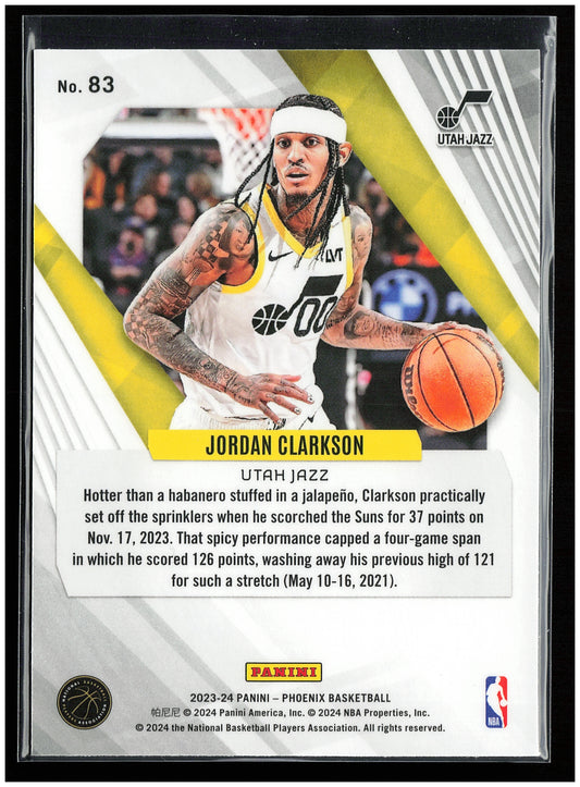 This is a nice example of a 2023-24 Panini Phoenix #83 Jordan Clarkson Other important information about this card:In 2023 Jordan Clarkson played for the Utah Jazz.Please check out our...
