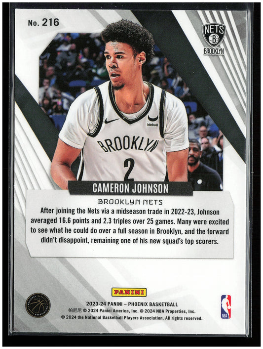 This is a nice example of a 2023-24 Panini Phoenix #216 Cameron Johnson Other important information about this card:In 2023 Cameron Johnson played for the Brooklyn Nets.Please check out our...