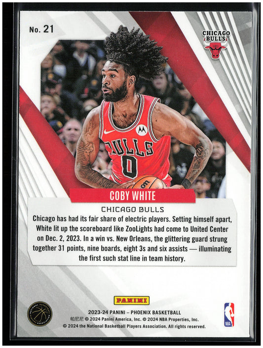 This is a nice example of a 2023-24 Panini Phoenix #21 Coby White Phoenix Red Ice Other important information about this card:In 2023 Coby White played for the Chicago Bulls.Please...
