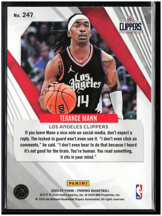 This is a nice example of a 2023-24 Panini Phoenix #247 Terance Mann Phoenix Red Ice Other important information about this card:In 2023 Terance Mann played for the Los Angeles...