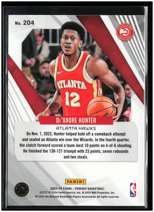 This is a nice example of a 2023-24 Panini Phoenix #204 De'Andre Hunter Phoenix Red Ice Other important information about this card:In 2023 De'Andre Hunter played for the Atlanta Hawks.Please...