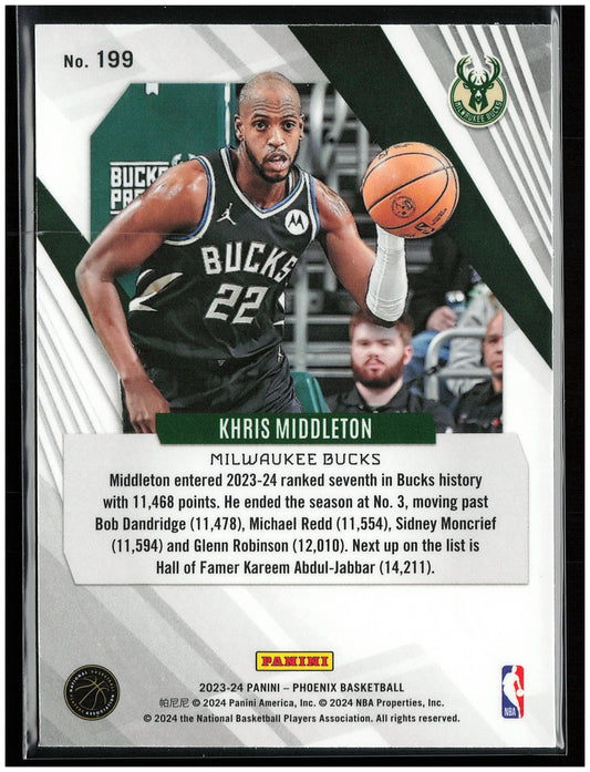 This is a nice example of a 2023-24 Panini Phoenix #199 Khris Middleton Other important information about this card:In 2023 Khris Middleton played for the Milwaukee Bucks.Please check out our...