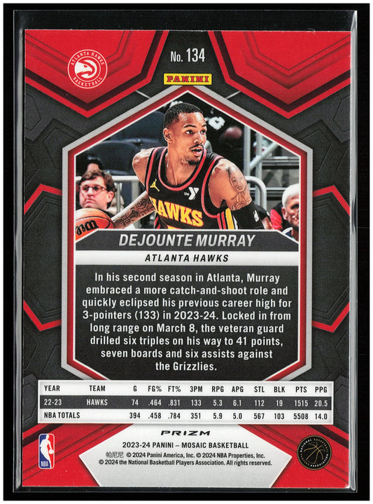 This is a nice example of a 2023-24 Panini Mosaic #134 Dejounte Murray Reactive Blue Other important information about this card:In 2023 Dejounte Murray played for the Atlanta Hawks.Please check...