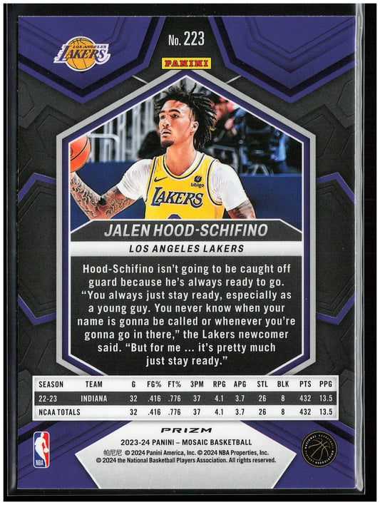 This is a nice example of a 2023-24 Panini Mosaic #223 Jalen Hood-Schifino Silver Other important information about this card:RCIn 2023 Jalen Hood-Schifino played for the Los Angeles Lakers.Please check...