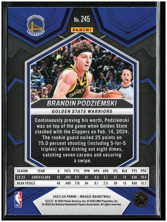 This is a nice example of a 2023-24 Panini Mosaic #245 Brandin Podziemski Other important information about this card:RCIn 2023 Brandin Podziemski played for the Golden State Warriors.Please check out...