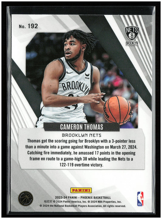 This is a nice example of a 2023-24 Panini Phoenix #192 Cameron Thomas Other important information about this card:In 2023 Cameron Thomas played for the Brooklyn Nets.Please check out our...