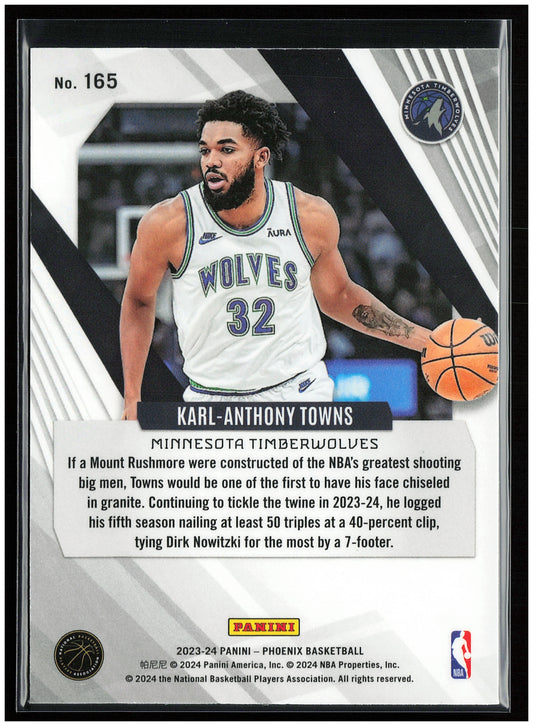 This is a nice example of a 2023-24 Panini Phoenix #165 Karl-Anthony Towns Other important information about this card:In 2023 Karl-Anthony Towns played for the Minnesota Timberwolves.Please check out our...
