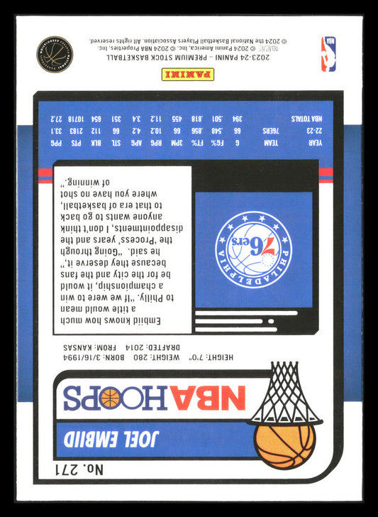 This is a nice example of a 2023-24 Hoops Premium Stock #271 Joel Embiid Other important information about this card:In 2023 Joel Embiid played for the Philadelphia 76ers.Please check out...