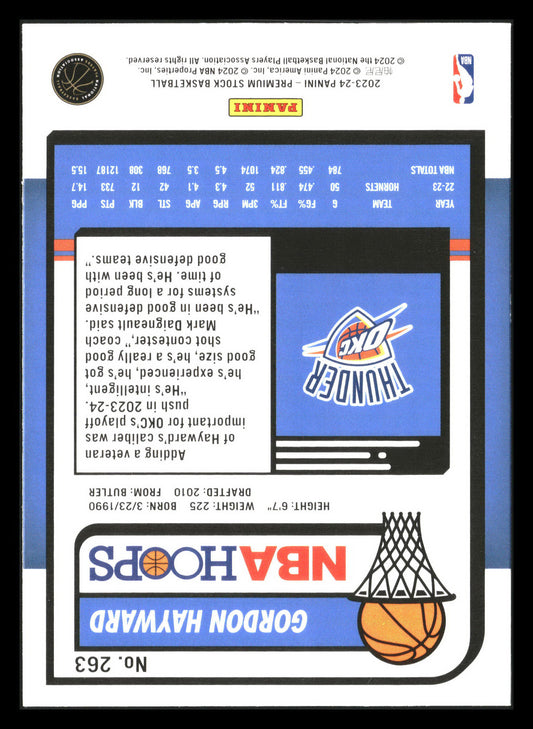 This is a nice example of a 2023-24 Hoops Premium Stock #263 Gordon Hayward Other important information about this card:In 2023 Gordon Hayward played for the Oklahoma City Thunder.Please check...