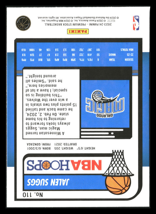 This is a nice example of a 2023-24 Hoops Premium Stock #110 Jalen Suggs Other important information about this card:In 2023 Jalen Suggs played for the Orlando Magic.Please check out...
