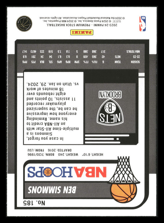 This is a nice example of a 2023-24 Hoops Premium Stock #185 Ben Simmons Other important information about this card:In 2023 Ben Simmons played for the Brooklyn Nets.Please check out...