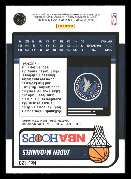 This is a nice example of a 2023-24 Hoops Premium Stock #128 Jaden McDaniels Other important information about this card:In 2023 Jaden McDaniels played for the Minnesota Timberwolves.Please check out...