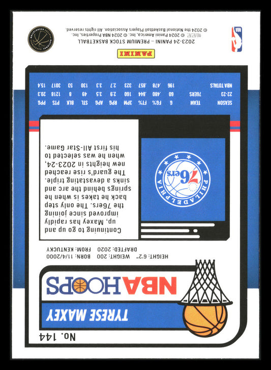 This is a nice example of a 2023-24 Hoops Premium Stock #144 Tyrese Maxey Other important information about this card:In 2023 Tyrese Maxey played for the Philadelphia 76ers.Please check out...