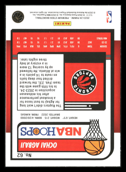 This is a nice example of a 2023-24 Hoops Premium Stock #62 Ochai Agbaji Other important information about this card:In 2023 Ochai Agbaji played for the Toronto Raptors.Please check out...