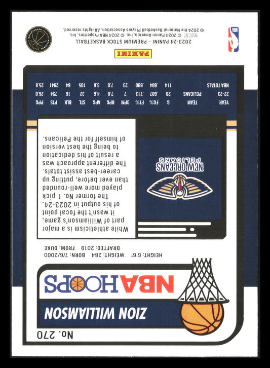 This is a nice example of a 2023-24 Hoops Premium Stock #270 Zion Williamson Other important information about this card:In 2023 Zion Williamson played for the New Orleans Pelicans.Please check...