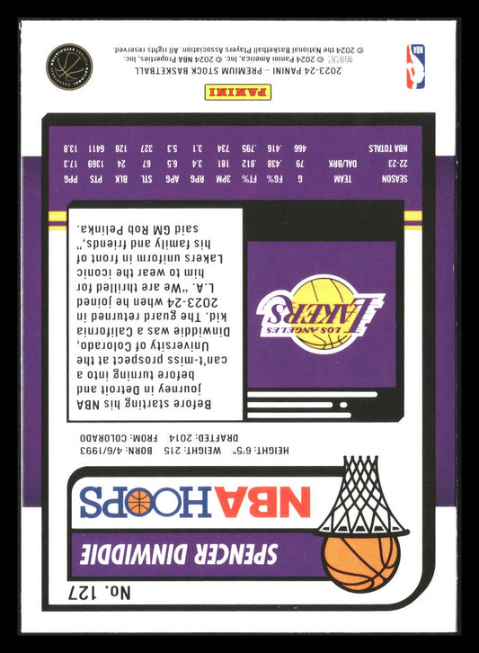 This is a nice example of a 2023-24 Hoops Premium Stock #127 Spencer Dinwiddie Other important information about this card:In 2023 Spencer Dinwiddie played for the Los Angeles Lakers.Please check...
