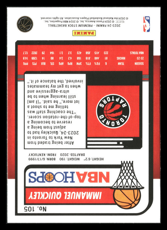 This is a nice example of a 2023-24 Hoops Premium Stock #105 Immanuel Quickley Other important information about this card:In 2023 Immanuel Quickley played for the Toronto Raptors.Please check out...