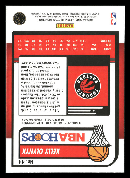 This is a nice example of a 2023-24 Hoops Premium Stock #44 Kelly Olynyk Other important information about this card:In 2023 Kelly Olynyk played for the Toronto Raptors.Please check out...