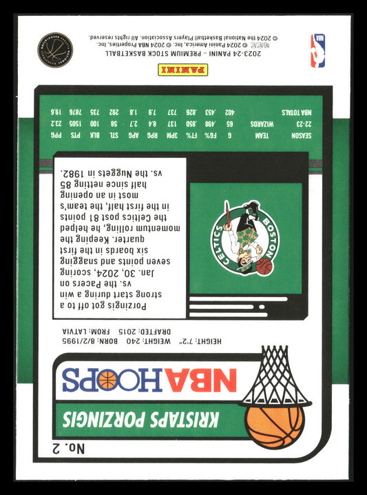 This is a nice example of a 2023-24 Hoops Premium Stock #2 Kristaps Porzingis Other important information about this card:In 2023 Kristaps Porzingis played for the Boston Celtics.Please check out...