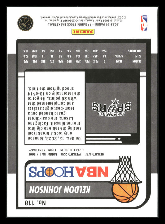 This is a nice example of a 2023-24 Hoops Premium Stock #118 Keldon Johnson Other important information about this card:In 2023 Keldon Johnson played for the San Antonio Spurs.Please check...