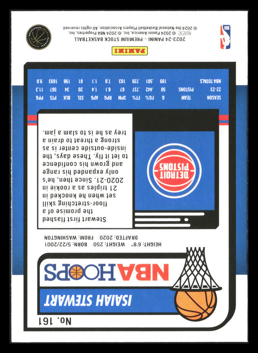 This is a nice example of a 2023-24 Hoops Premium Stock #161 Isaiah Stewart Other important information about this card:In 2023 Isaiah Stewart played for the Detroit Pistons.Please check out...
