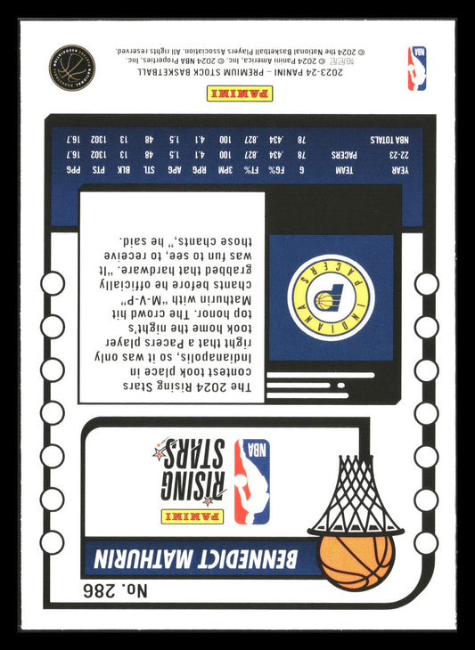 This is a nice example of a 2023-24 Hoops Premium Stock #286 Bennedict Mathurin Other important information about this card:In 2023 Bennedict Mathurin played for the Indiana Pacers.Please check out...