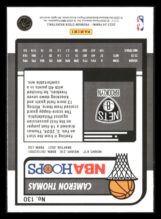 This is a nice example of a 2023-24 Hoops Premium Stock #130 Cameron Thomas Other important information about this card:In 2023 Cameron Thomas played for the Brooklyn Nets.Please check out...